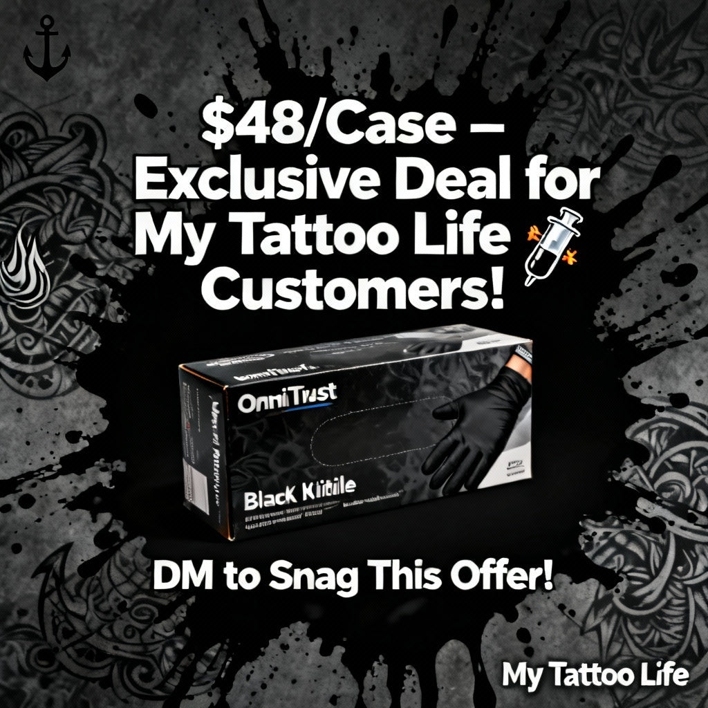 Hey My Tattoo Life fam! We’re rolling out a killer deal just for you—OmniTrust Black Nitrile Gloves at only $48 per case! That’s right, if you’re already grabbing supplies from us online or on our weekly route, this exclusive price is all yours.